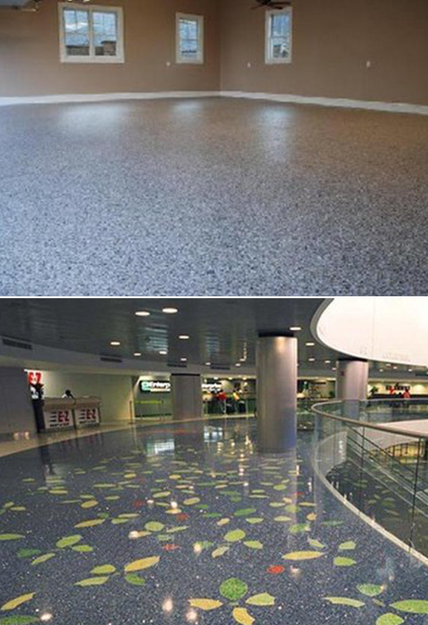 产品简介:环氧彩砂装饰地坪是以彩色石英砂和环氧材料组成的无缝一体化的新型复合装饰地坪,通过一种或多种不同颜色的彩色石英砂自由搭配,形成丰富多彩的装饰色彩及图案具有装饰质感优雅,耐磨损、耐抗压、耐化学腐蚀、防滑、防水等优点。彩砂环氧树脂装饰地坪性能稳定可靠,装饰效果更加美观,使用范围更加广泛,在欧美等发达国家十分流行,被誉为“彩砂无缝硬地毯”。