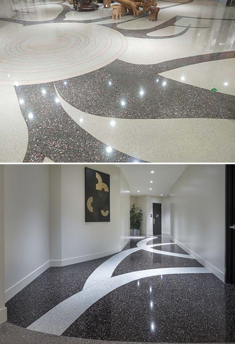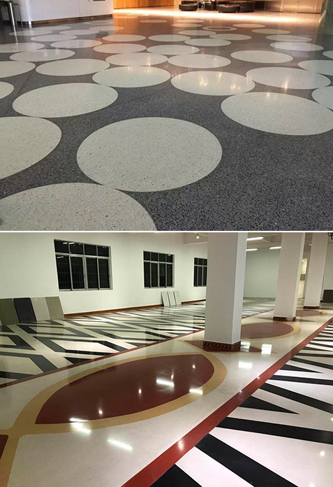 产品简介:无机磨石地坪是一种含有金属和非金属特殊骨料合成的装饰砂浆与固体强化层组合而形成的多层结构地面,厚度在8mm-12mm,具有极其良好的耐磨耐压及抗化学腐蚀性能。成品表面会产生比大理石完美的效果,色彩绚丽、图案精美,其中任何色彩和图案几乎无限制地呈现,可尽情表达设计师的设计想象,获得令人满意的装饰效果。