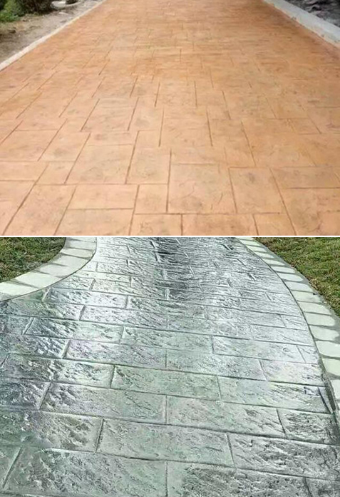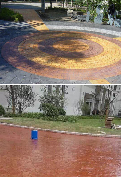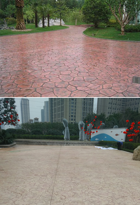 压印艺术混凝土地坪是通过在混凝土表层加入强化料,脱模粉,成型模具,配着着色剂,混凝土保护剂及使用专业的工具在混凝土表面表现出各种不同质地,不同纹理,各种色泽的特殊艺术地面效果。